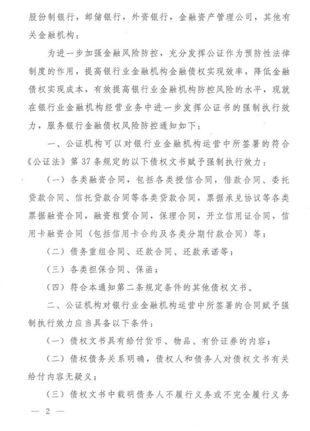 为进一步加强金融风险防控,充分发挥公证作为预防性法律制度的作用,提高银行业金融机构金融债权实现效率,降低金融债权实现成本,有效提高银行业金融机构防控风险的水平,现就在银行业金融机构经营业务中进一步发挥公证书的强制执行效力,服务银行金融债权风险防控通知如下:
