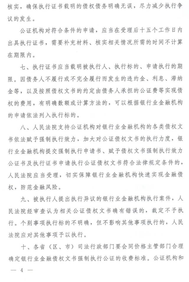 十、各省(区、市)司法行政部门要会同价格主管部门合理 确定银行业金融债权文书强制执行公证的收费标准。公证机构和银行业金融机构协商一致的,可以在办理债权文书公证时收取部分费用,出具执行证书时收齐其佘费用。