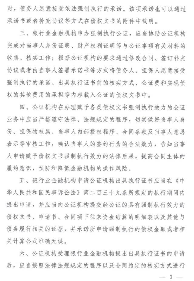 四、公证机构在办理赋予各类债权文书强制执行效力的公证 业务中应当严格遵守法律、法规规定的程序,切实做好当事人身份、担保物权属、当事人内部授权程序、合同条款及当事人意思表示等审核工作,确认当事人的签约行为的合法效力,告知当事人申请赋予债权文书强制执行效力的法律后果,提高合同主体的履约意识,预防和降低金融机构的操作风险。