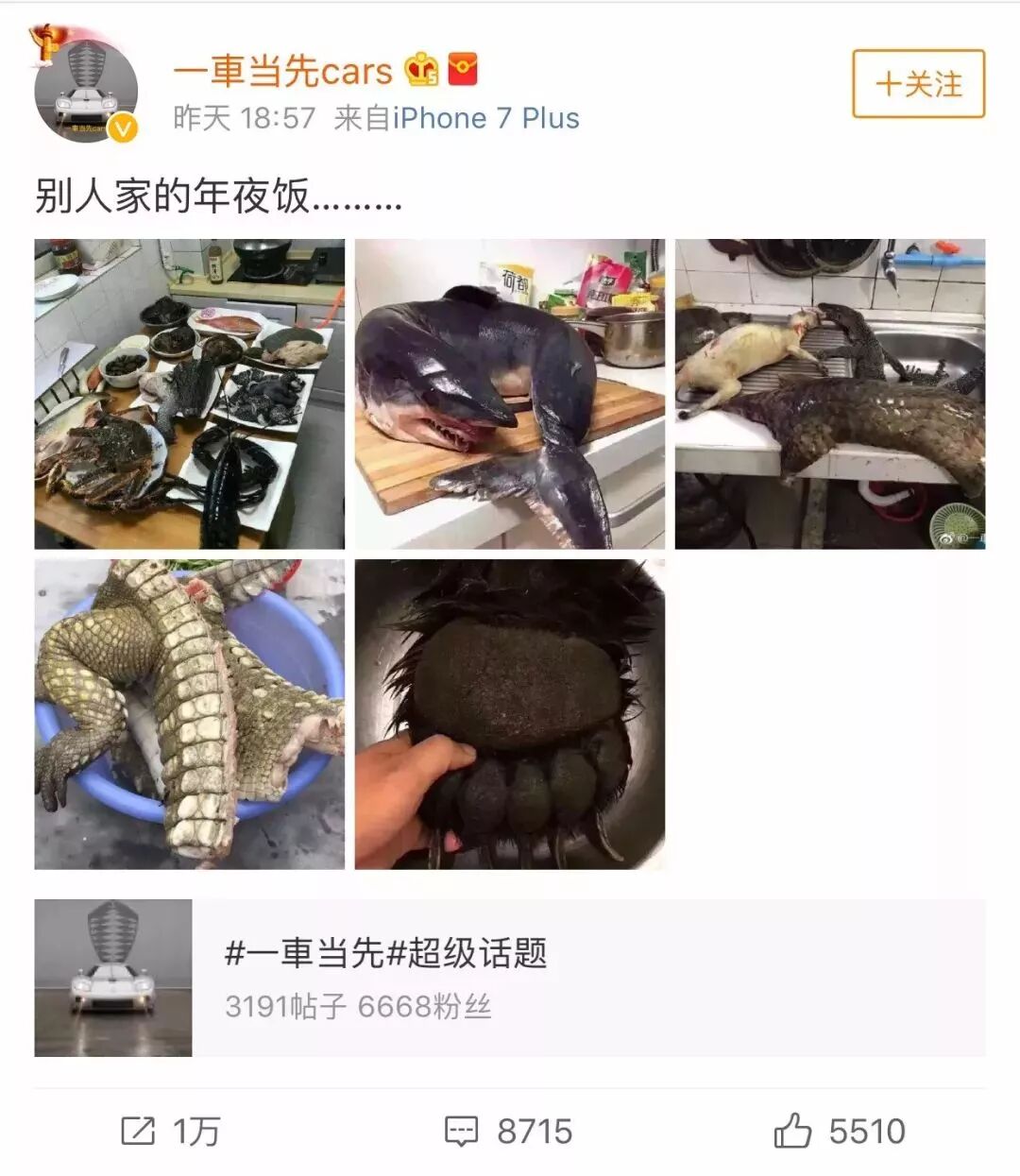 通报称,2月15日(除夕)晚7时,一账号为(一车当先cars)的微博博主发布了一条名为“别人家的年夜饭……”的消息,并配发一组摆放在厨房里待烹制的熊掌、穿山甲、鳄鱼等野生动物的照片,引发了网民的广泛关注和大量转发。