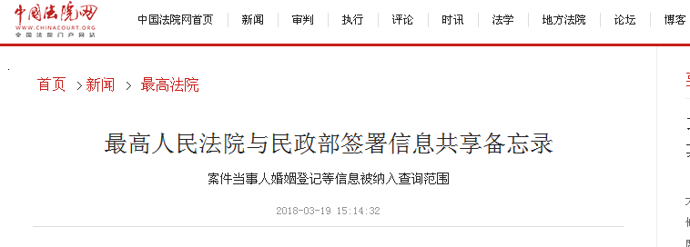 最高人民法院与民政部签署信息共享备忘录 案件当事人婚姻登记等信息被纳入查询范围 近日,最高人民法院与民政部正式签署《关于开展部门间信息共享的合作备忘录》,建立信息共享机制。 最高人民法院与民政部通过网络专线实现共享当事人的婚姻登记信息、低保信息(包括家庭收入信息)、社会组织登记信息、涉婚姻和涉社会救助对象收入财产的案件信息、失信被执行人(社会组织)名单信息等;同时民政部对纳入失信被执行人名单的社会组织加强管理,实施信用约束和联合惩戒。 以上共享信息将纳入法院“总对总”网络执行查控系统。今后,人民法院在办理执行案件时,可以通过“总对总”网络执行查控系统,查询到案件当事人的婚姻登记信息、低保信息(包括家庭收入信息)、社会组织登记信息等信息,进一步拓展“总对总”网络执行查控系统的查控范围,提高执行效率。 《备忘录》的签署是最高人民法院和民政部全面贯彻党的十九大精神、认真落实党中央、国务院关于加快推进部门间信息共享和业务协同、健全失信惩戒机制、推进社会诚信体系建设、加强和创新社会治理等决策部署的一项重大举措,将进一步健全网络执行查控机制,推进公共资源改革,加强部委间合作,完善民政部门相关数据信息,加大各领域惩戒力度,促使失信被执行人主动履行生效法律文书确定的义务,助力解决执行难,维护司法权威,推动社会信用体系建设,不断提高司法公信力。   截至目前,全国法院通过最高人民法院“总对总”网络执行查控系统,为3910万件案件提供查询冻结服务,共冻结资金2020.7亿元,查询到车辆3206.9万辆、证券571.1亿股、渔船和船舶51.9万艘、互联网银行存款36.5亿元。共发布失信被执行人996.1万人,累计限制1014.8万人次购买飞机票,限制391.2万人次购买列车软卧、高铁、其他动车组一等座以上车票;仅中国工商银行一家就拒绝失信被执行人申请贷款、办理信用卡148.9万余笔,涉及资金101.16亿余元;221.5万人慑于信用惩戒主动履行了义务或者与申请执行人协商达成和解协议;有力维护了当事人合法权益。
