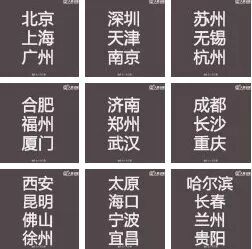 北京、上海、广州、深圳、天津、南京、苏州、无锡、杭州、合肥、福州、厦门、济南、郑州、武汉、成都、长沙、重庆、西安、昆明、佛山、徐州、太原、海口、宁波、宜昌、哈尔滨、长春、兰州、贵阳。