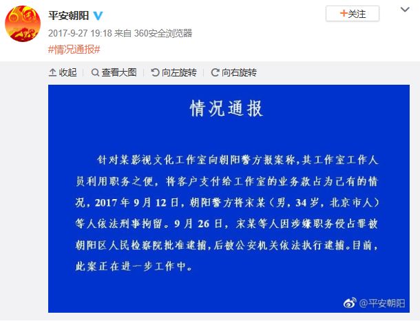 10月18日上午,宋喆、修雨乐职务侵占案在北京市朝阳区人民法院一审宣判。被告人宋喆、修雨乐因犯职务侵占罪,分别被判处有期徒刑六年、三年。