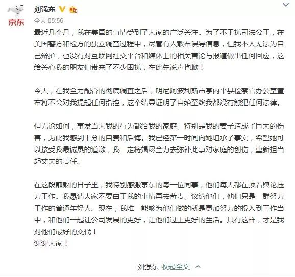 刘强东致歉:感到十分的自责和后悔