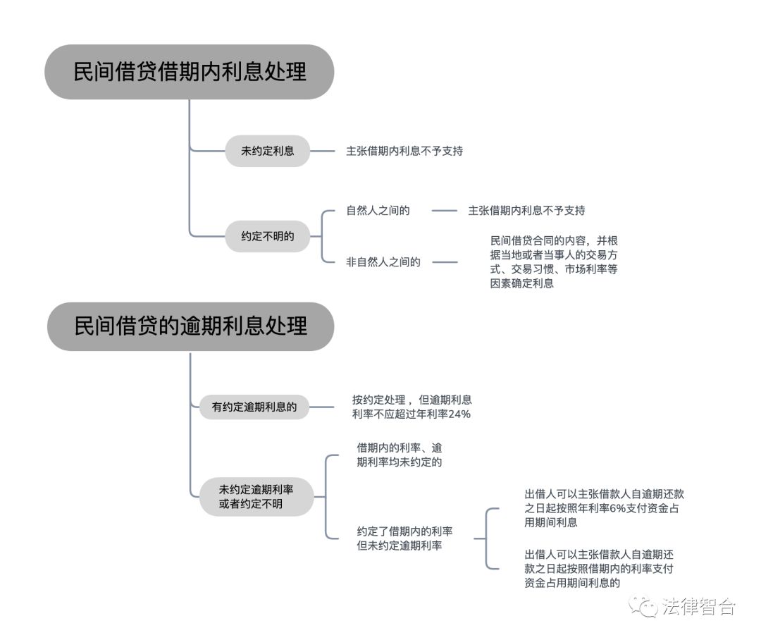 第二十五条 借贷双方没有约定利息,出借人主张支付借期内利息的,人民法院不予支持。 自然人之间借贷对利息约定不明,出借人主张支付利息的,人民法院不予支持。除自然人之间借贷的外,借贷双方对借贷利息约定不明,出借人主张利息的,人民法院应当结合民间借贷合同的内容,并根据当地或者当事人的交易方式、交易习惯、市场利率等因素确定利息。 第二十九条 借贷双方对逾期利率有约定的,从其约定,但以不超过年利率24%为限。 未约定逾期利率或者约定不明的,人民法院可以区分不同情况处理: (一)既未约定借期内的利率,也未约定逾期利率,出借人主张借款人自逾期还款之日起按照年利率6%支付资金占用期间利息的,人民法院应予支持; (二)约定了借期内的利率但未约定逾期利率,出借人主张借款人自逾期还款之日起按照借期内的利率支付资金占用期间利息的,人民法院应予支持。