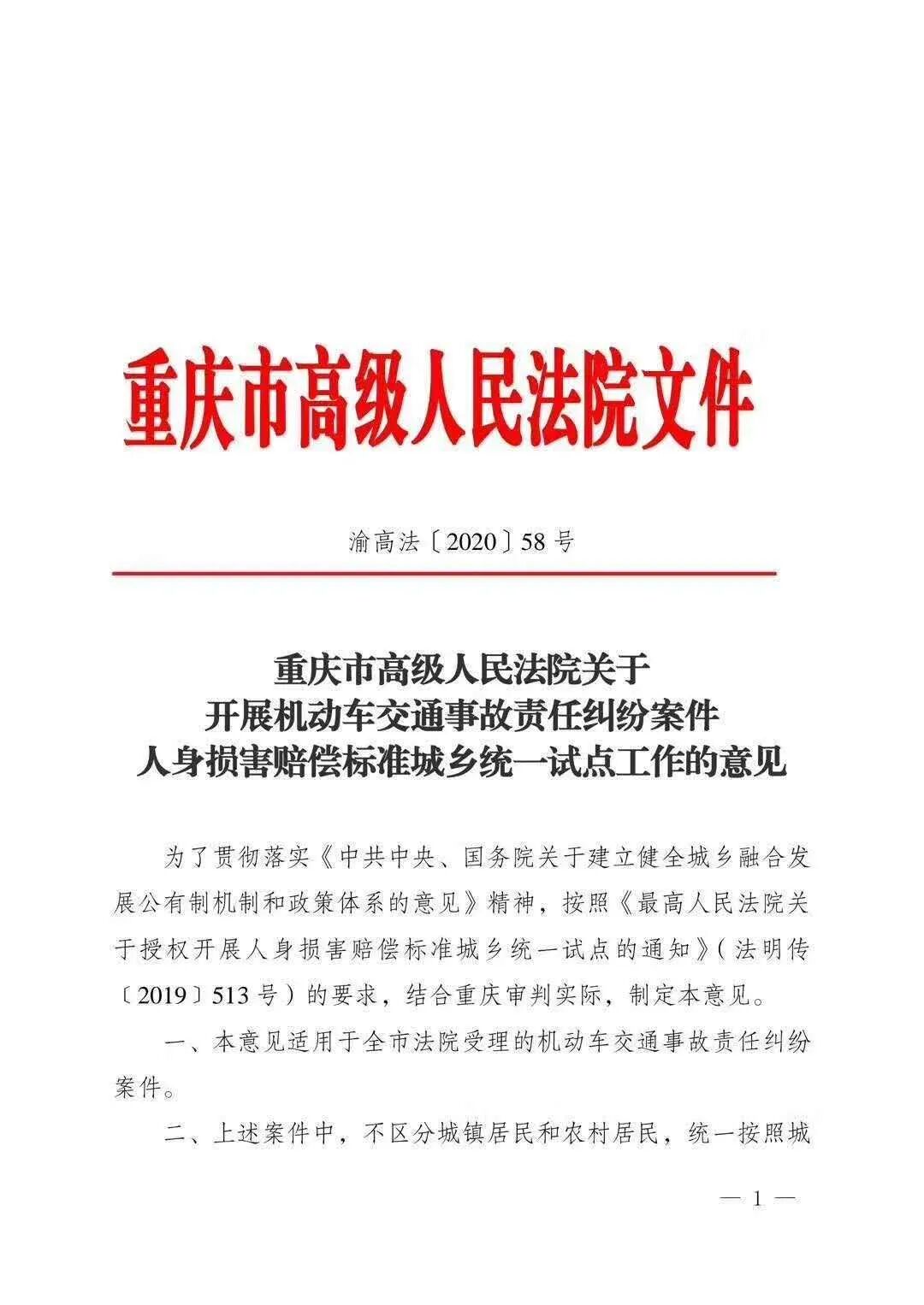 根据新华社5月5日全文发布《中共中央国务院关于建立健全城乡融合发展体制机制和政策体系的意见》以来,全国各地法院陆续出台了人身损害赔偿案件中统一城乡居民赔偿标准的试点意见,今天也有幸迎来了重庆本地的试点意见。就该意见,笔者简要解读以下几点。